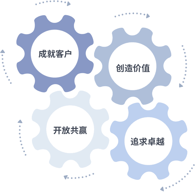 成就客户是一切决策的出发点,,创造价值是衡量所有工作的标准,,,,追求卓越是我们做事做人的态度,,,,开放共赢是我们的格局也是最终的结果。。。。价值观的齿轮环环相扣,,,,推动着组织里的每个人不断向前。。。